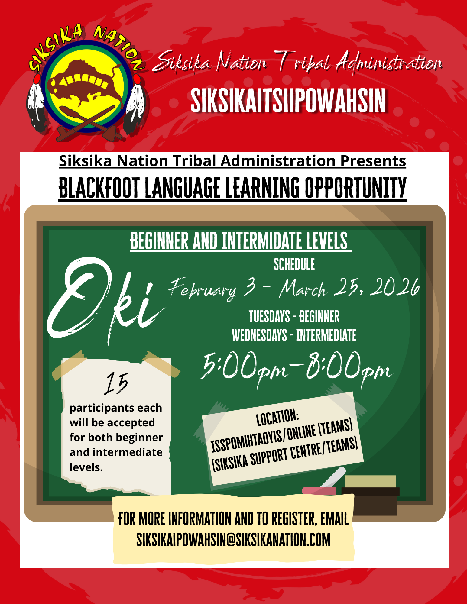 Siksika Nation Tribal Administration is excited to announce a Blackfoot language learning opportunity. There will be beginner and intermediate levels.