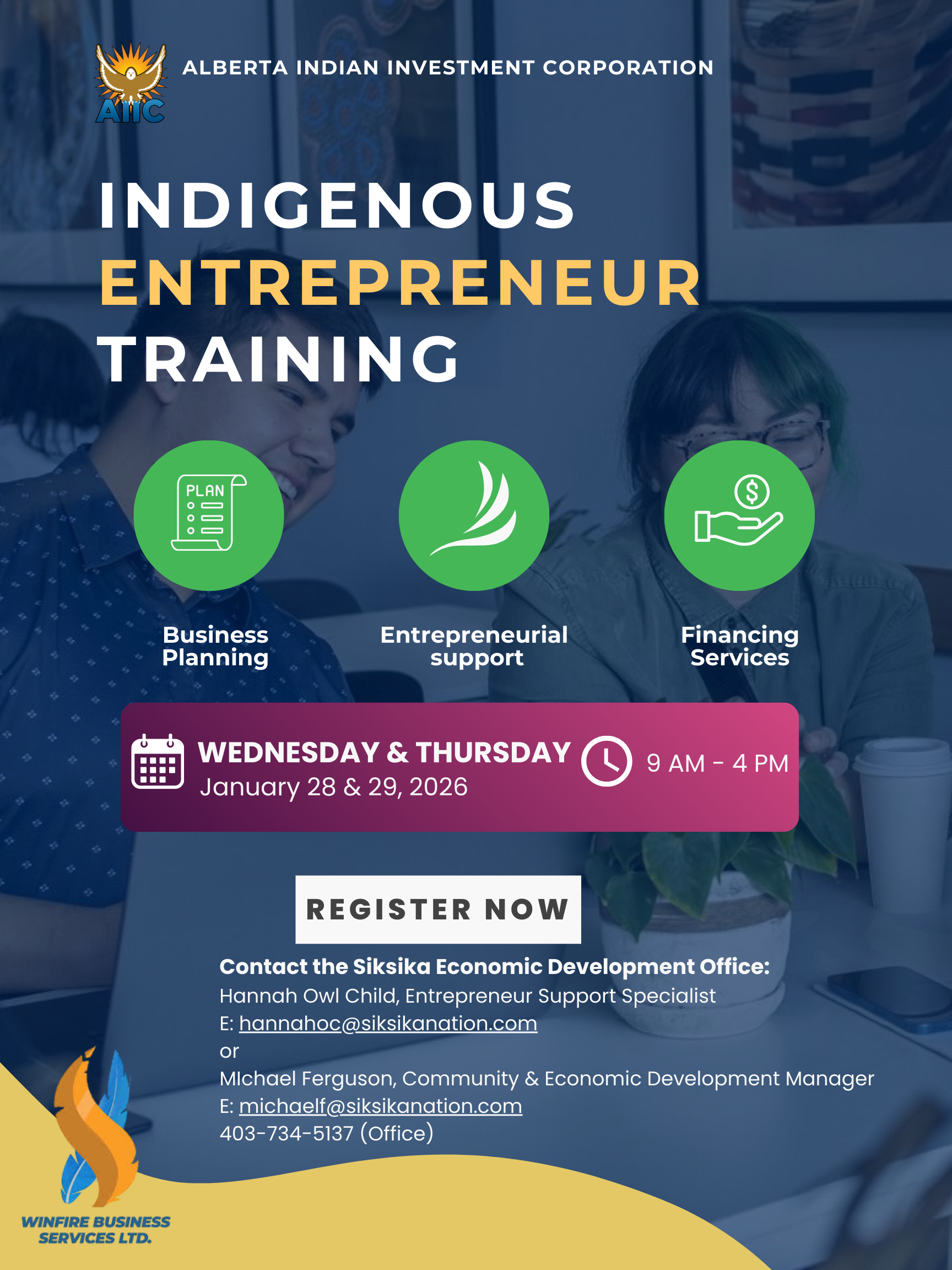 Siksika Economic Development is hosting a two-day Indigenous Entrepreneur Training Workshop presented by AIIC and Winfire Business Services Ltd!