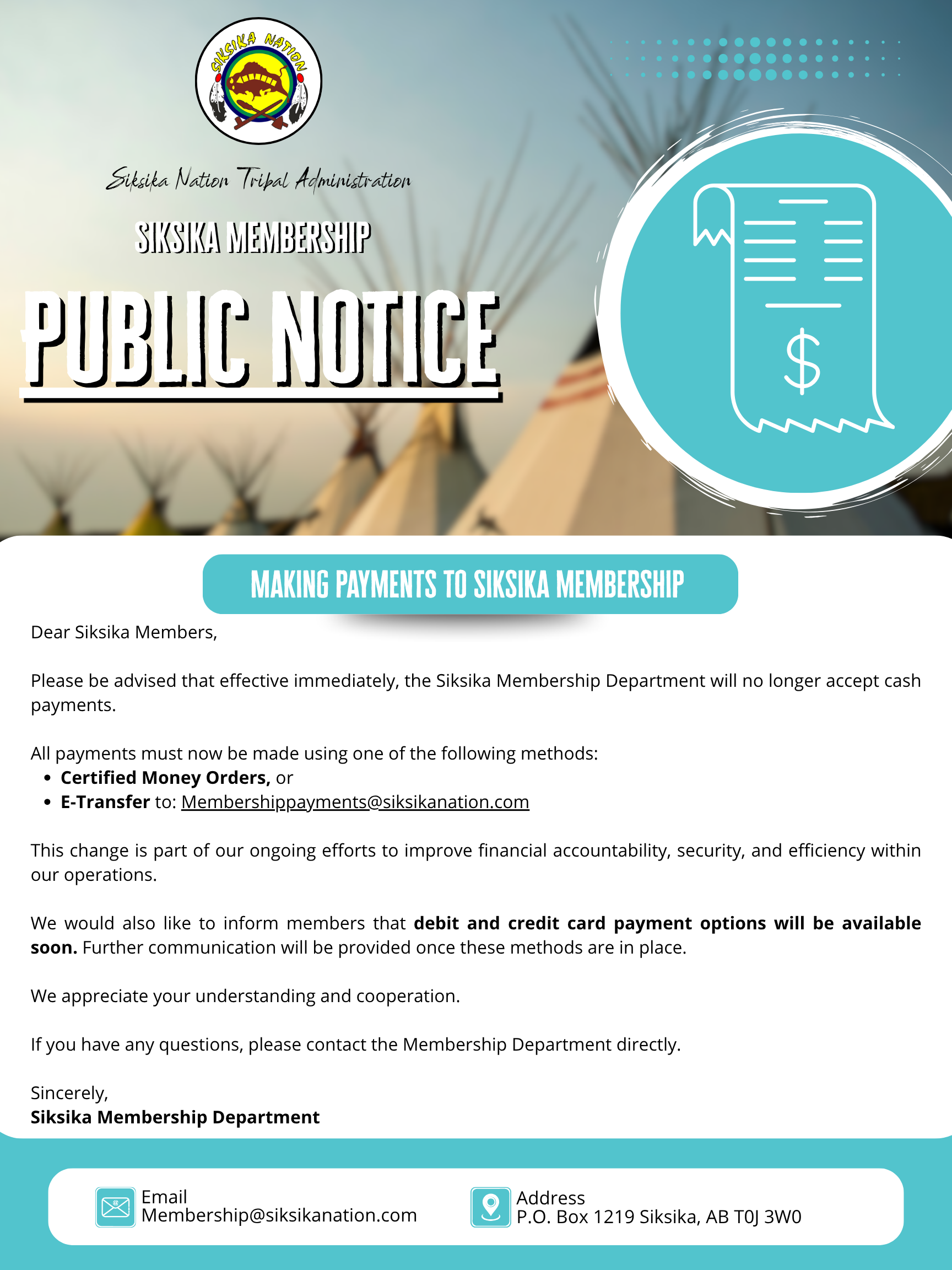 Please be advised that effective immediately, the Siksika Membership Department will no longer accept cash payments.