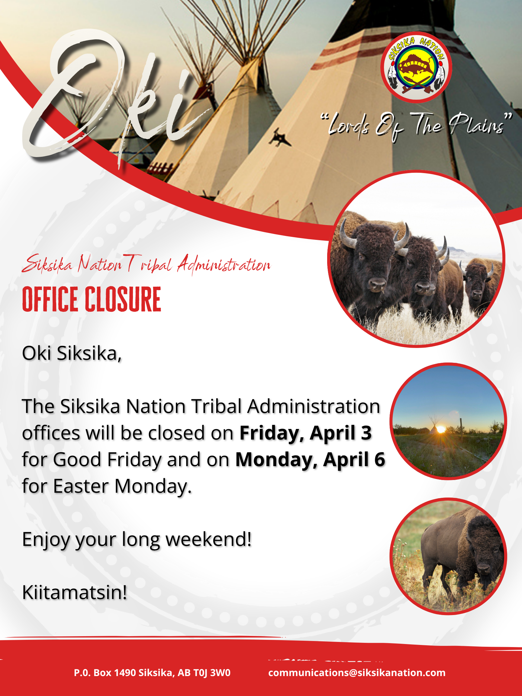 The Siksika Nation Tribal Administration offices will be closed on Friday, April 3 for Good Friday and Monday, April 6 for Easter Monday