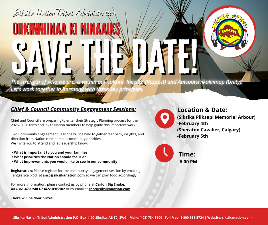 Registration: Please register for the community engagement session by emailing Tangee Scalplock at sncc@siksikanation.com so we can plan food accordingly.