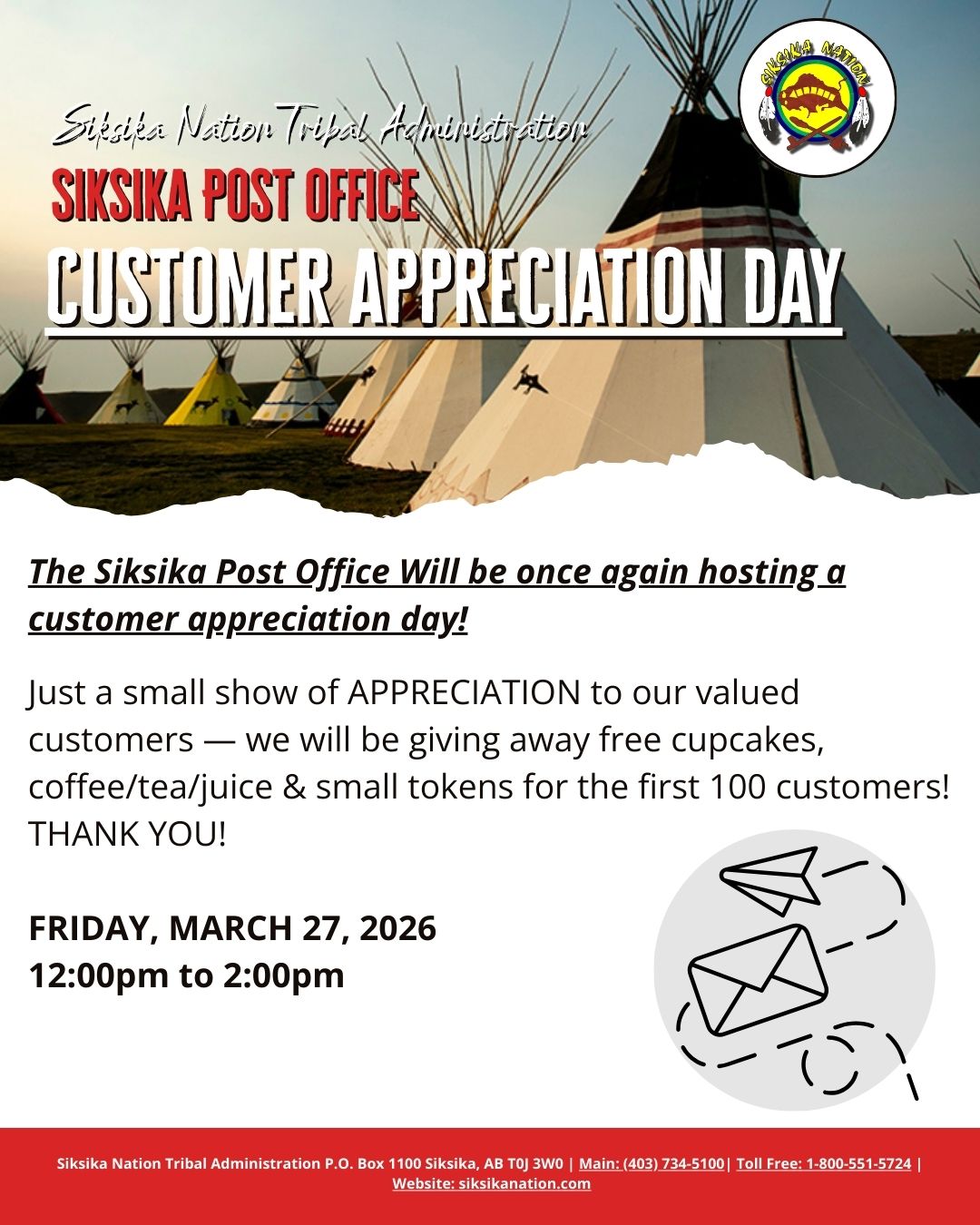 Don’t forget to join the Siksika Post Office in celebrating customer appreciation day today from 12:00pm – 2:00pm!