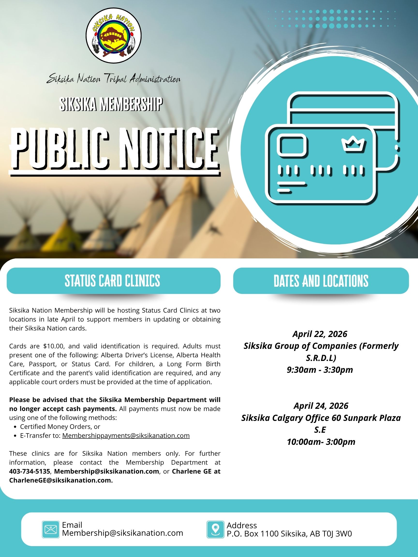 Siksika Nation Membership will be hosting Status Card Clinics at two locations in late April to support members in updating or obtaining their Siksika Nation cards.