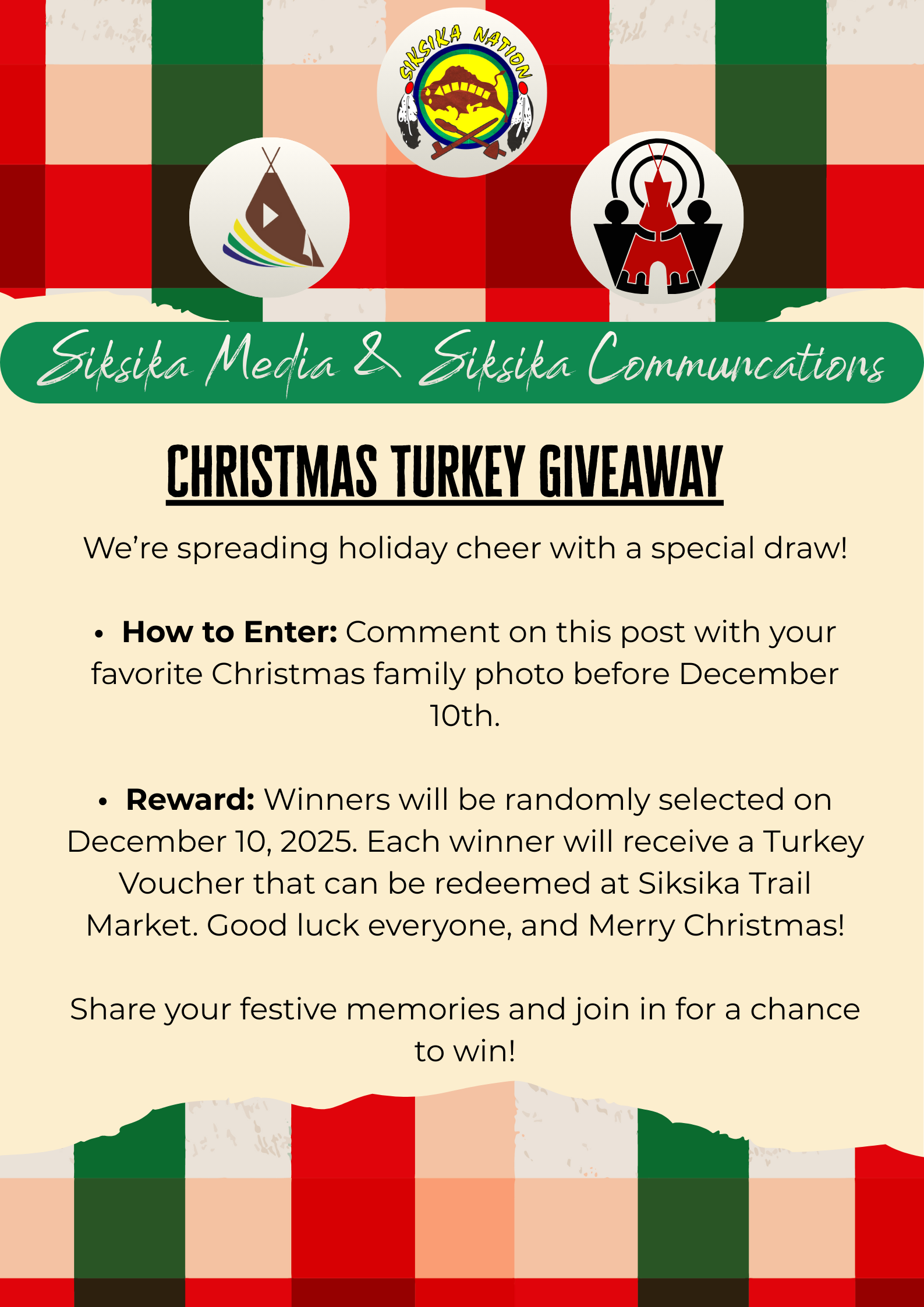 Reward: Winners will be randomly selected on Dec. 10, 2025. Each winner will receive a turkey voucher that can be redeemed at Siksika Trail Market.