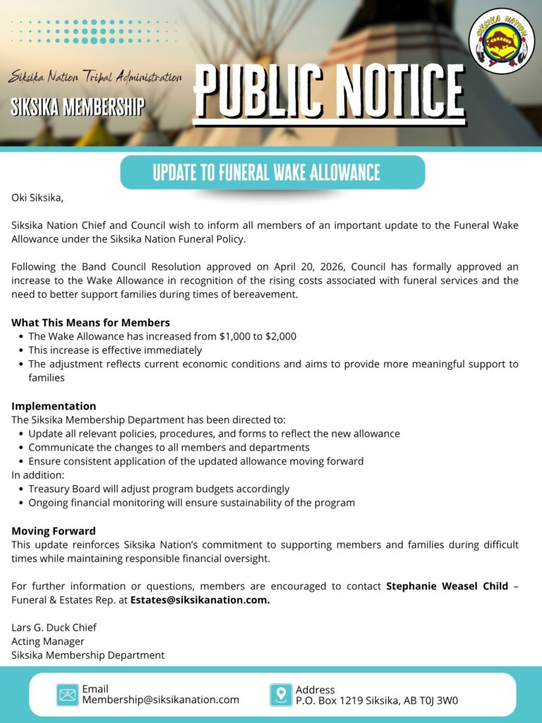 Siksika Nation Chief and Council wish to inform all members of an important update to the Funeral Wake Allowance under the Siksika Nation Funeral Policy.